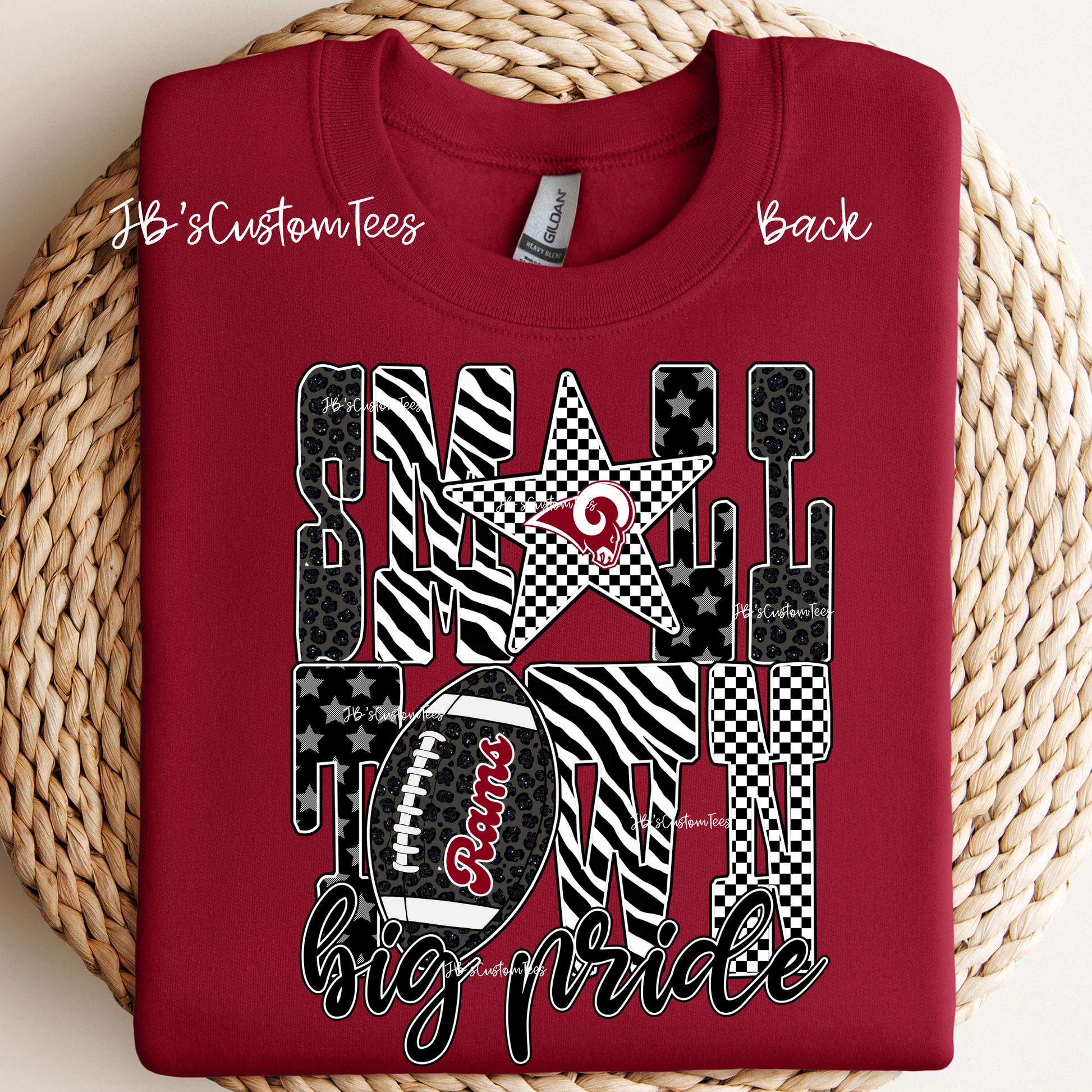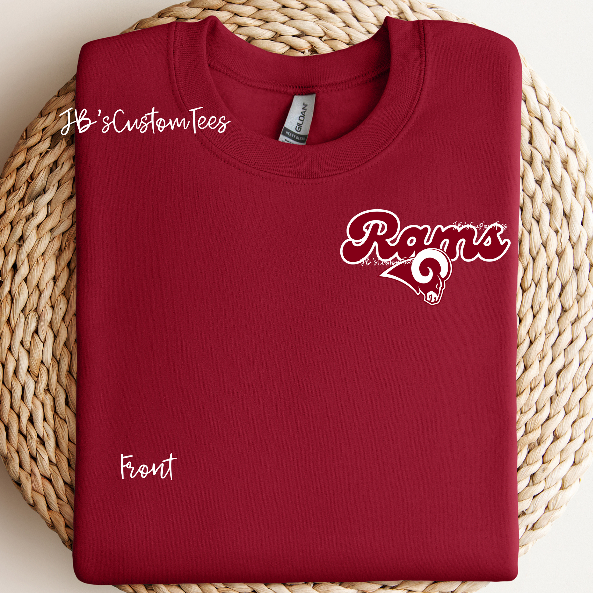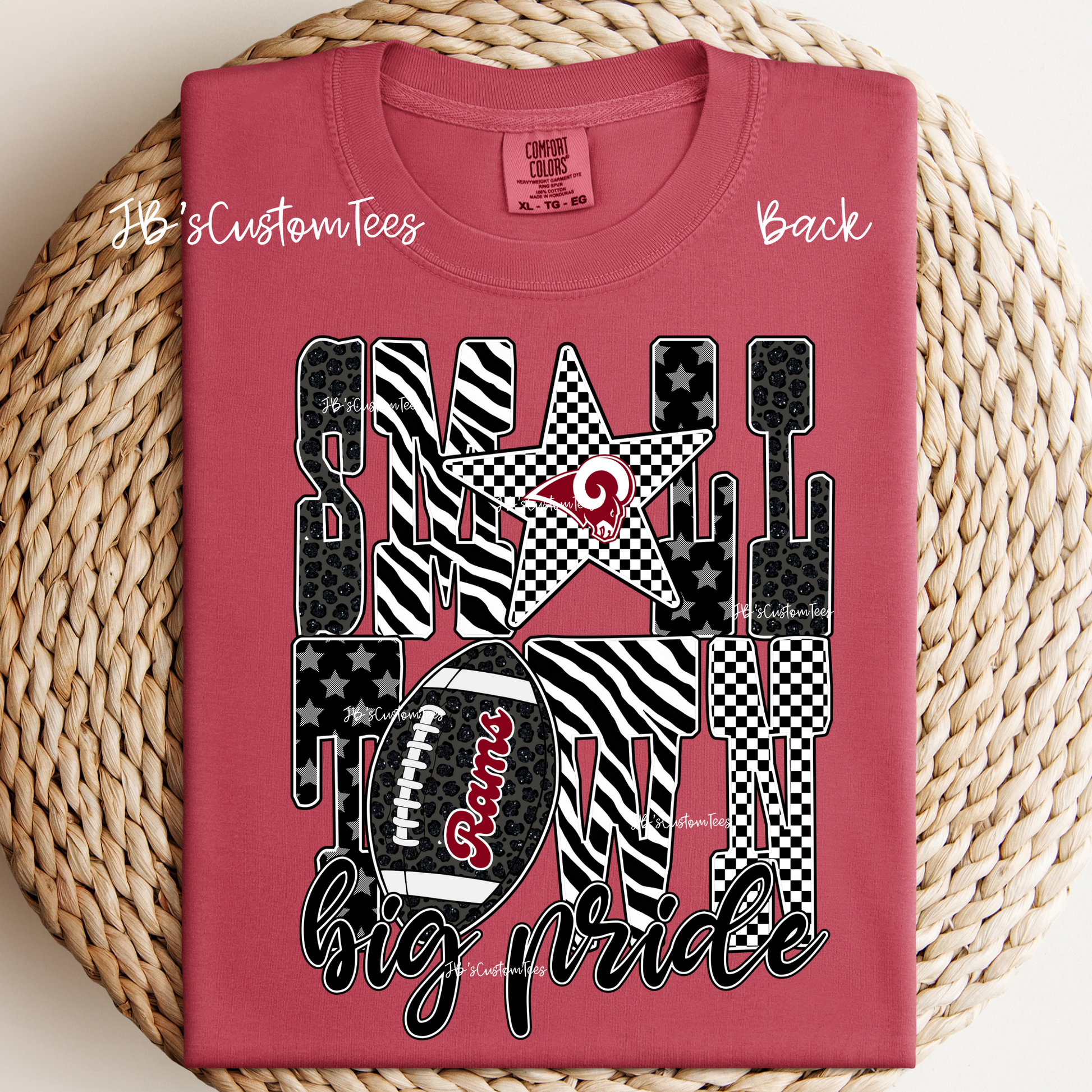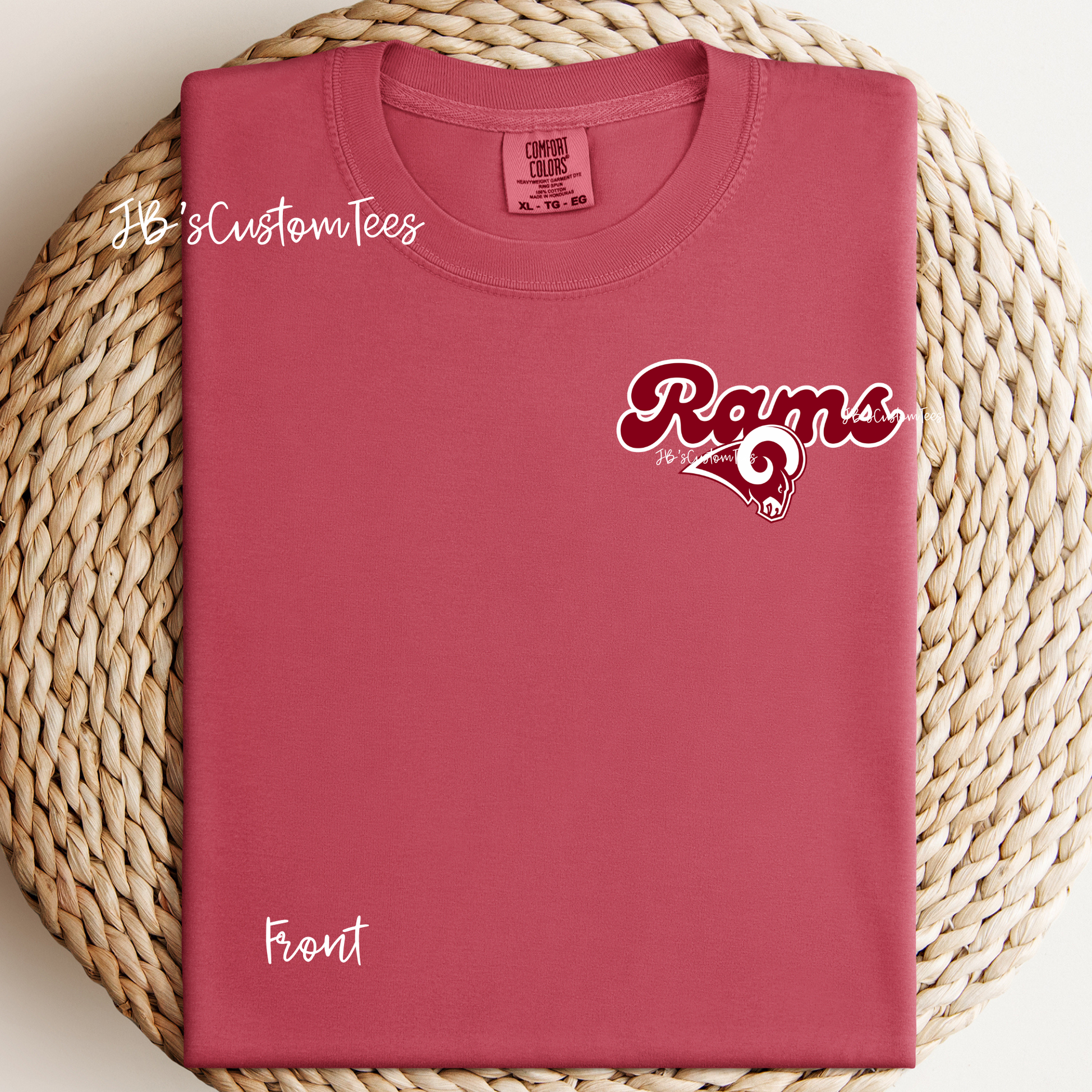 This design has a front left chest design and a large back design. The darker red is Cardinal by Gildan and the lighter shade is crimson by comfort colors.
